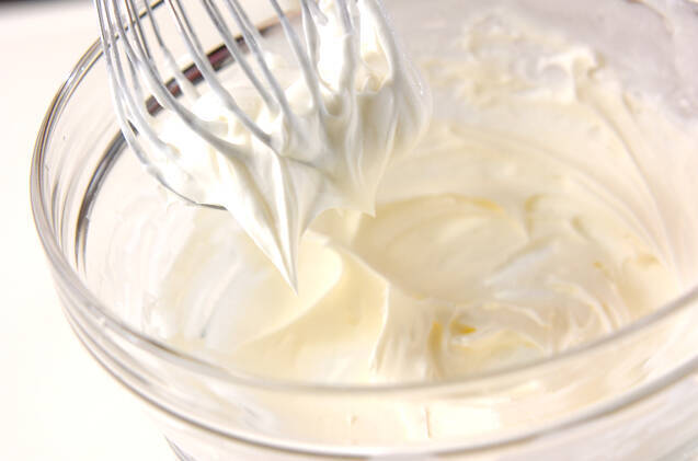<ホイップクリーム>を作る。ボウルに生クリーム、上白糖を入れ、ボウルの底を氷水に当てながら、泡立て器で軽く角が立つ位まで泡立て、冷蔵庫で冷やしておく。
