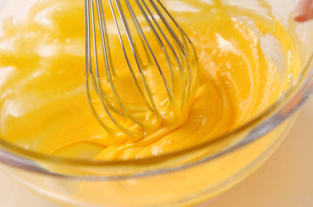 ボウルに卵黄4個分を入れ、泡立て器でほぐし、塩、上白糖を加える。白っぽくなるまで、上白糖をすり混ぜて溶かすように泡立て器でしっかり混ぜる。