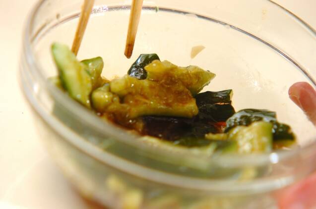 <調味料>の材料を混ぜ合わせ、キュウリ、ショウガを和えて器に盛る。