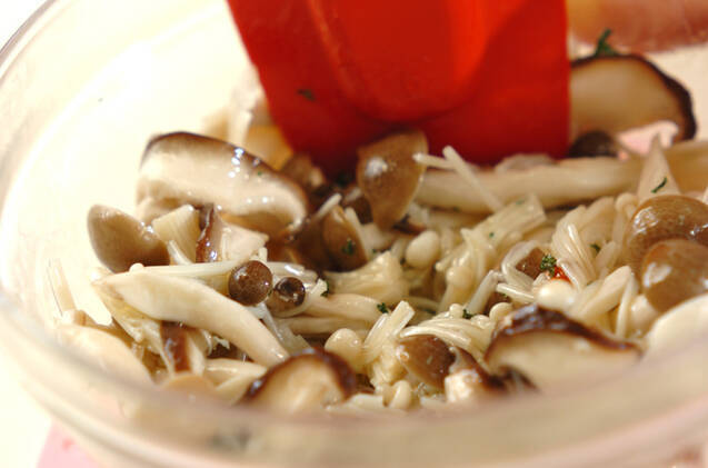 分量外の塩少々を入れたたっぷりの熱湯で、シイタケ、シメジ、エノキをサッとゆでる。ザルに上げてしっかり水気をきり、熱いうちに<マリネ液>のボウルに加えて混ぜ合わせる。