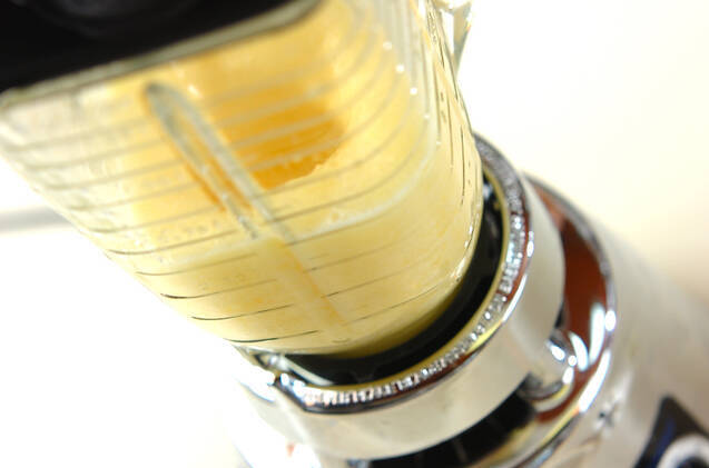 <シロップ>、パイナップル、ホワイトキュラソーをミキサーにかけ、<ソース>を作る。