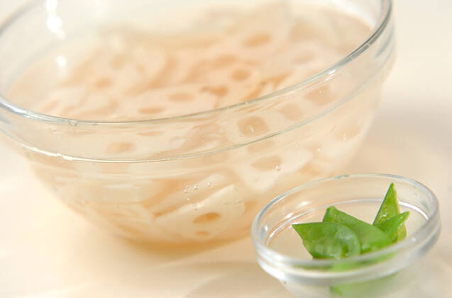 レンコンは皮をむき、縦半分に切って薄いイチョウ切りにし、酢小さじ1.5を入れた水に放つ。
