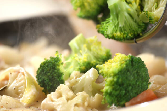 煮立ってきたらアクを取って、火を少し弱めフライパンの蓋をして10~15分煮る。(2)の<ホワイトソース>を加え、5~6分煮込み、ブロッコリーを加える。塩コショウで味を調え、器に注ぎ分ける。