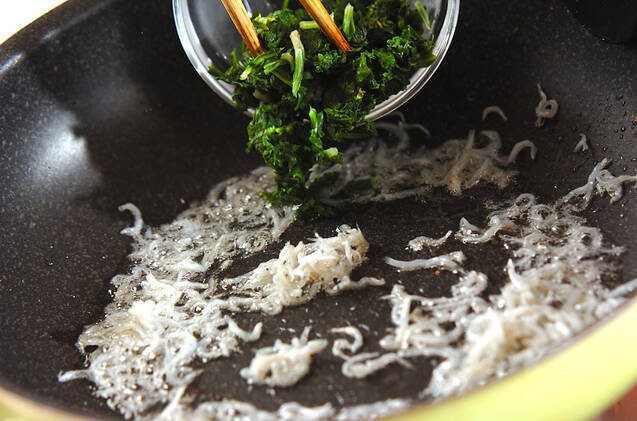 フライパンにサラダ油、チリメンジャコを入れて強火にかけ、全体に炒められたらセロリの葉を加えて炒め合わせる。