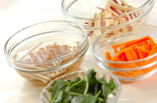 新ゴボウは水洗いし、長さ5cmの棒状に切って水に放つ。