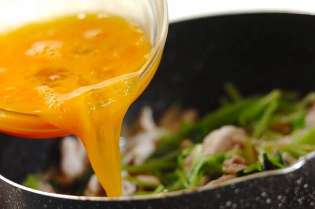 火加減を中火にし、煮たったら<卵液>をまわし入れて鍋に蓋をし、お好みのかたさに火が通ったら器に盛る。