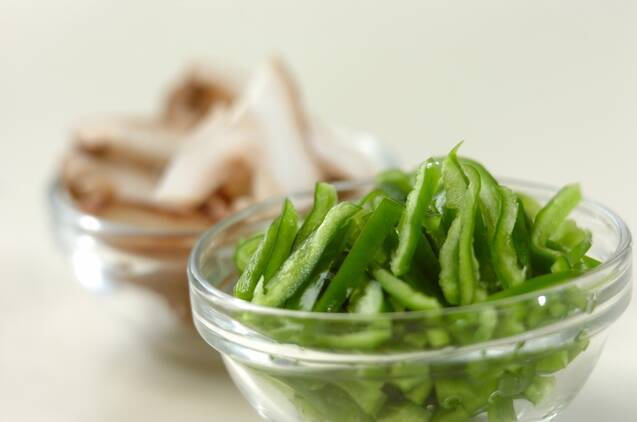 ピーマンはヘタと種を取り、長さを半分に切って細切りにする。シイタケは石づきを取り、軸と笠は薄切りにする。