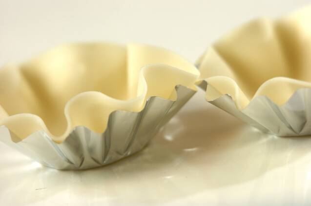 アルミカップに餃子の皮を入れ、縁を花びらのように型どる。(2)を入れてピザ用チーズをのせ、トースターで約3分焼く。