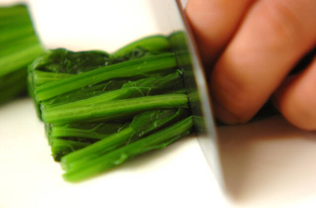 青菜は塩を入れた熱湯でゆでて水に取り、粗熱が取れたら水気を絞る。根元を少し切り落とし、食べやすい長さに切る。