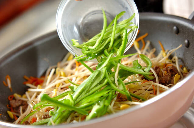 フライパンにゴマ油、ニンニクを入れて中火にかけ、香りがたったら強火にして牛肉を炒め、肉の色が変わったらニンジン、豆モヤシ、ピーマンを加えて炒める。