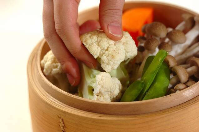 せいろに野菜を入れ、しっかり湯気が上がった蒸し器に入れて野菜が柔らかくなるまで蒸す。<ゴマダレ>を添える。
