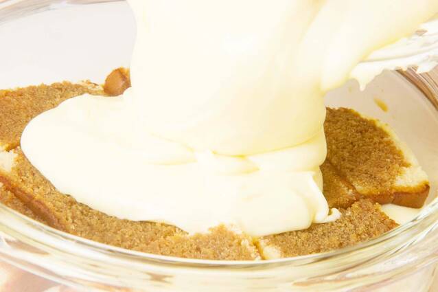 残りのカステラを全体にのせ<コーヒー液>をしみ込ませ、残った4のクリームを流し込み、表面を平らにし1時間以上、冷蔵庫で冷やしなじませる。