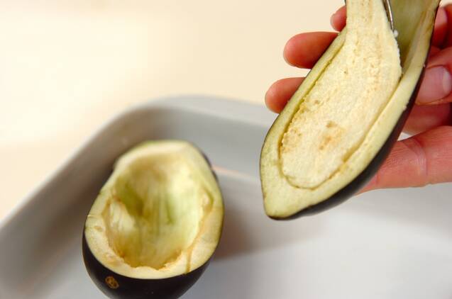 ナスは縦半分に切り、中をスプーンでくり抜き、水にさらしておく。くり抜いた中身は角切りにする。ベーコンは角切りにする。プチトマトはヘタを取り、4等分にする。