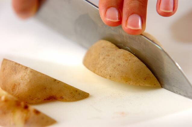 ジャガイモは皮ごときれいに水洗いして水気を拭き取り、8~10個のくし切りにする。