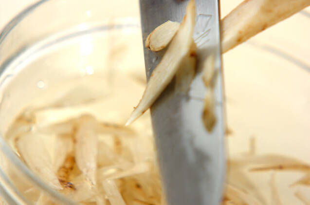 ゴボウはタワシできれいに水洗いし、ささがきにして水に放つ。