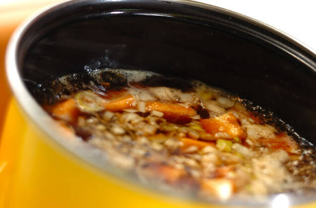 鍋に水、春雨を入れて火にかける。沸騰したら、厚揚げ、白ネギ、ショウガ、しょうゆ、みりん、スープの素を加えて煮込む。