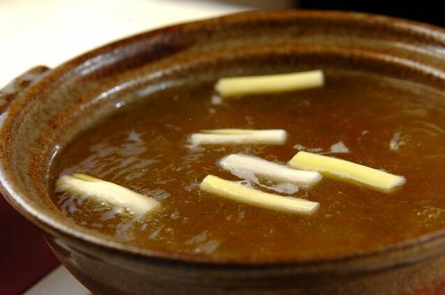 鍋に<調味液>の材料と白ネギの芯を入れ、強火でひと煮たちさせる。