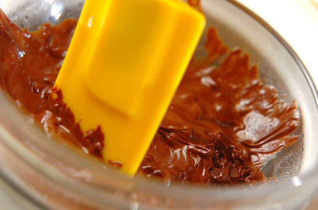 チョコレートを入れたボウルを湯せんにかけ(指をつけ少し熱いくらいのお湯にボウルの底をつけ)、ゴムベラで混ぜながら溶かし、アーモンドダイスを加えて混ぜ合わせる。