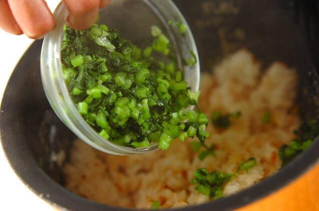 炊き上がったら10分蒸らす。炊飯器の底から持ち上げるように混ぜ、余分な水分を飛ばさせる。カブの葉、白ゴマを加えて混ぜ合わせ、器に盛る。