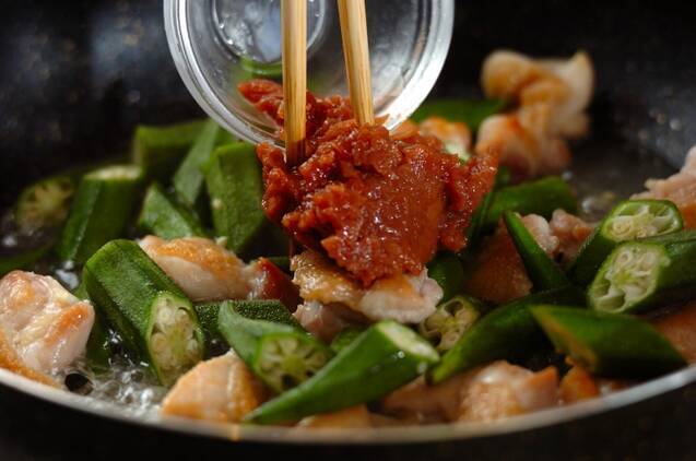 オクラと梅肉を加え、強めの中火で煮からめて器に盛り、大葉をのせる。