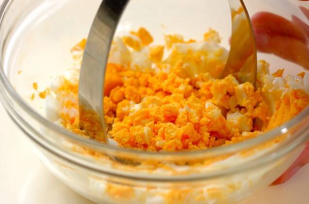 ボウルに<卵サラダ>のゆで卵を入れてマッシャーでつぶし、その他の材料と混ぜ合わせる。