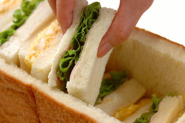 卵サンドとハムサンドを2等分に切り、食パンの箱に交互に入れる。お皿に乗せて、パセリとマイクロトマトを飾る。食パンの蓋にリボンを結ぶ。