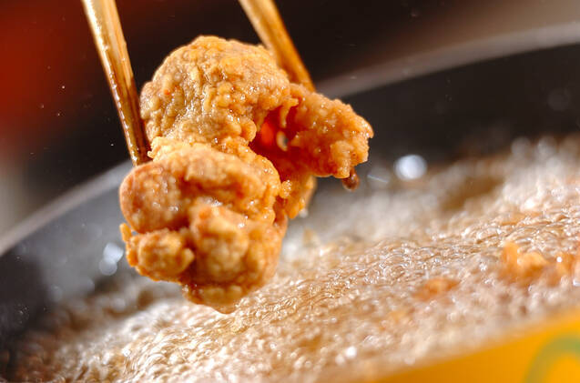 揚げ油に(3)を入れ、カラッと揚げる。 器にサラダ菜を敷き、鶏の唐揚げ、トマト、レモンを盛り合わせる。