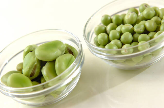 エンドウ豆、ソラ豆はサヤから出す。ソラ豆の薄皮が固い場合は薄皮もむく。