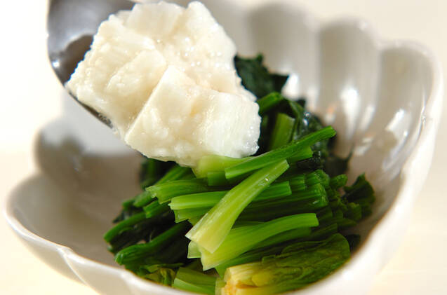 器にホウレン草を盛ってたたいた長芋をかけ、焼きのりを散らす。<ワサビしょうゆ>を添え、よく混ぜて食べる。