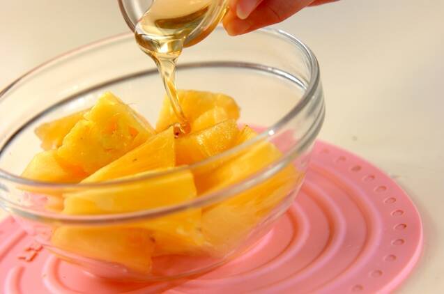 パイナップルは皮と芯を切り落とし、小さなひとくち大に切ってボウルに入れ、ハチミツをからめる。