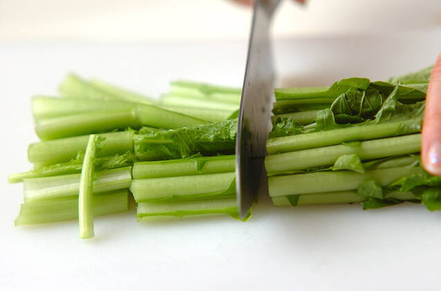 青菜は根元を少し切り落とし、きれいに水洗いして長さ4cmに切る。(ヒント)小松菜、チンゲンサイ、水菜、みぶ菜、ハクサイ菜、白菜等、他の葉野菜で代用できます。