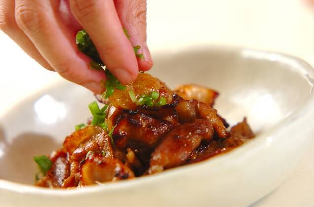 <合わせ調味料>の材料を加えて肉にしっかりからめたら器に盛り付け、ネギを上に散らす。