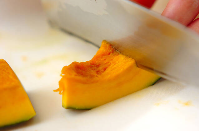 カボチャは種とワタを取り、所々皮を削ぎ落とし、大きめのひとくち大に切る。
