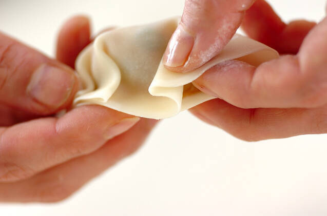 餃子の皮に(1)を大さじ1弱のせ、皮の縁に水をぬってひだを作りながら包む。