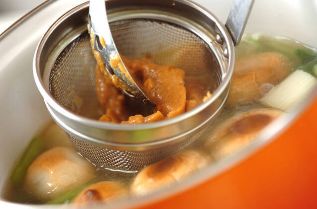 小松菜がしんなりしたら、みそを溶き入れ、刻みネギを加えて火を止め、器によそう。