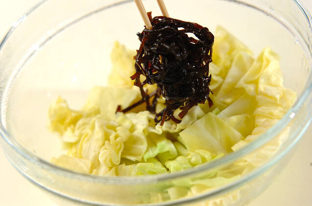 キャベツの蒸し汁を捨て、昆布と塩を加えて味を調え、器に盛る。