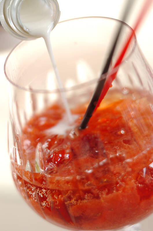 <アレンジ>グラスの氷水を流して、グラスを拭き、イチゴペーストを入れて、イチゴをのせる。クラッシュアイスを入れてマリブとヨーグルトリキュールを注ぎ、ストローに沿わせてイチゴリキュールを注ぎ入れる。