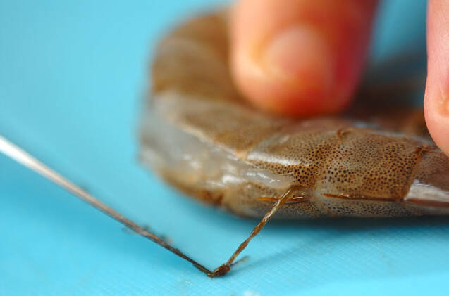 エビは足を取り、殻つきのまま背の真ん中に包丁を入れて背ワタを取る。塩と片栗粉を揉み込み、水でよく洗って水気を拭き取る。