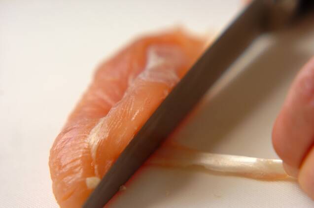 カボチャはワタと種を取り、皮ごと1.5cm角に切る。鶏ささ身は筋を取り、ひとくち大の削ぎ切りにし、酒をかけてもみ、塩コショウをする。