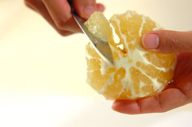 グレープフルーツは皮をむく。ザルを重ねたボウルの上で、中心に向かって包丁を入れ、実を取り出す。