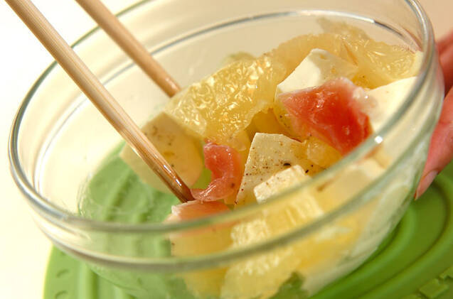 (1)のボウルに、グレープフルーツ、(2)、<調味料>の材料を加えて和える。
