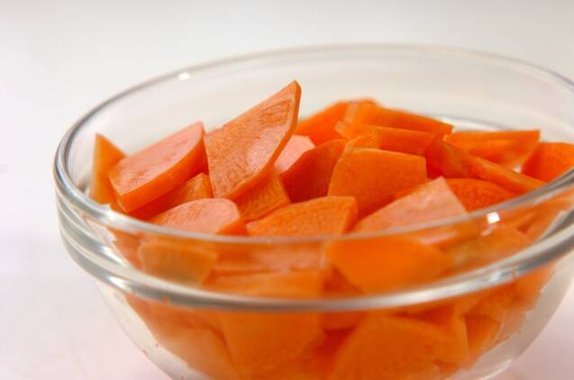 ニンジンはヘタを切り落とし、皮をむいて縦4つに切り、イチョウ切りにする。