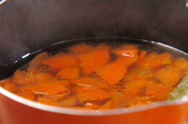 分量の水とローリエを入れ、蓋をして10分程度、中火から弱火で煮る。アクがでたら取り除く。