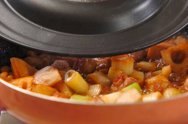 アクを取り、白ネギを加えて蓋をし、時々混ぜながら中火で10分煮る。蓋を取り、強火にして煮汁が少なくなるまで煮詰め、器に盛る。