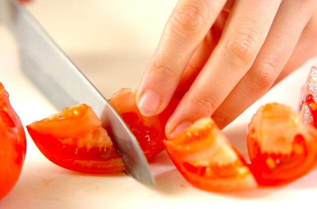 トマトはヘタをくり抜き、ひとくち大に切る。