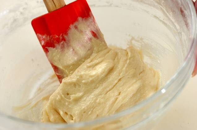 砂糖を加えてよくすり混ぜ、牛乳、バニラエッセンスを加えて混ぜ、薄力粉を加えて粉けがなくなるまで混ぜる。