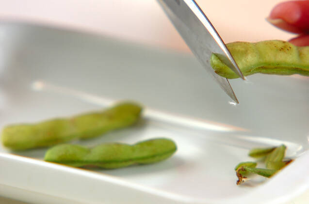 枝豆は両端をハサミで落とし、塩をまぶしつける。そのまま熱湯でサッとゆで、サヤからだして豆だけにする。