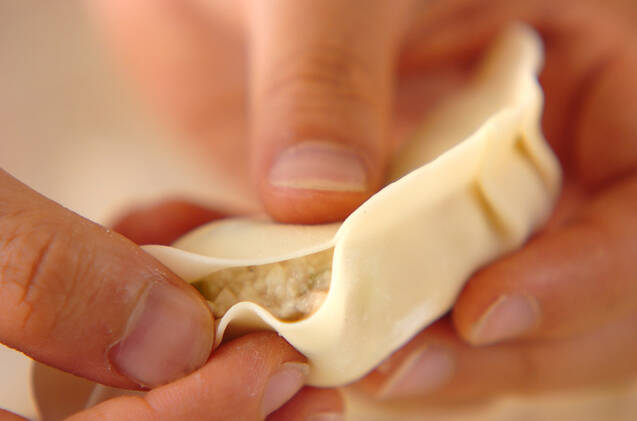 餃子の皮を手に取り、(1)の種を大さじ1位のせ、皮のフチに水をグルッと1周薄くぬり、しわをよせながら包む。