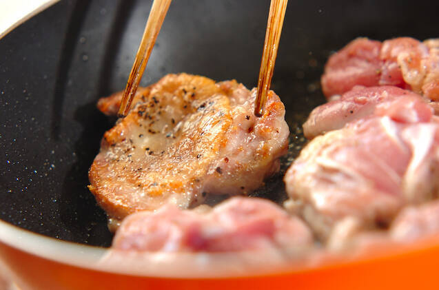 フライパンにオリーブ油を入れて中火で熱し、鶏もも肉の皮を下にして並べ入れ、焼き色がついて8割程火が通ったらひっくり返し、同様に焼き色をつけ、器に盛る。