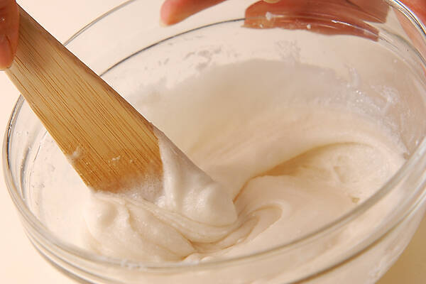 耐熱ボウルに上新粉、白玉粉、グラニュー糖を合わせて水を加え、よく混ぜ合わせる。